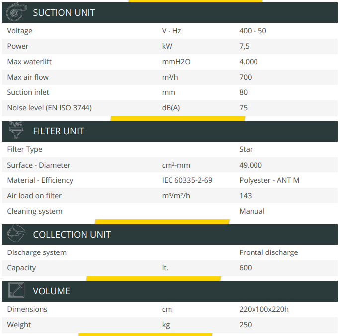 Le VS600 T75 est un séparateur sous vide doté d’une capacité de collecte extrêmement importante, adapté à l’aspiration de matériaux solides. Sa particularité est qu’il est prêt pour les chariots élévateurs, ce qui signifie que le séparateur peut être soulevé et que le contenu aspiré peut être évacué directement en ouvrant la trappe avant avec un levier de sécurité.